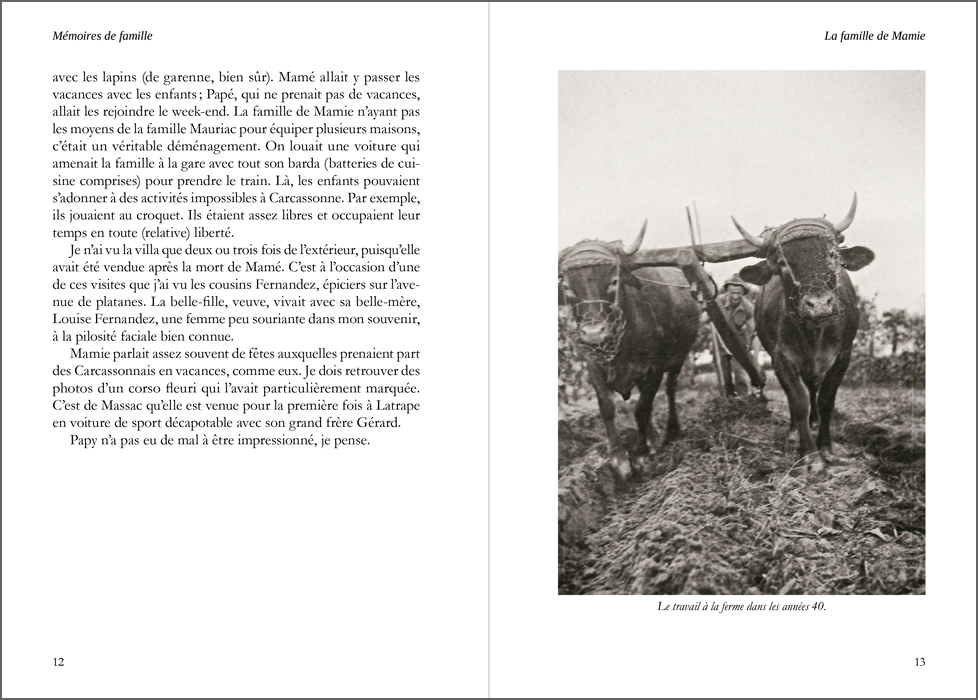 Mise en page d'une biographie familiale. Ce livre représente bien le travail que je fais pour des particuliers mais aussi pour des maisons d'édition. Une mise en page d'apparence simple avec que du texte et quelques images. Mais, comme vous pouvez le voir dans la partie « Méthode de travail » de ce site, beaucoup d'opérations sont faites pour avoir un rendu impeccable.